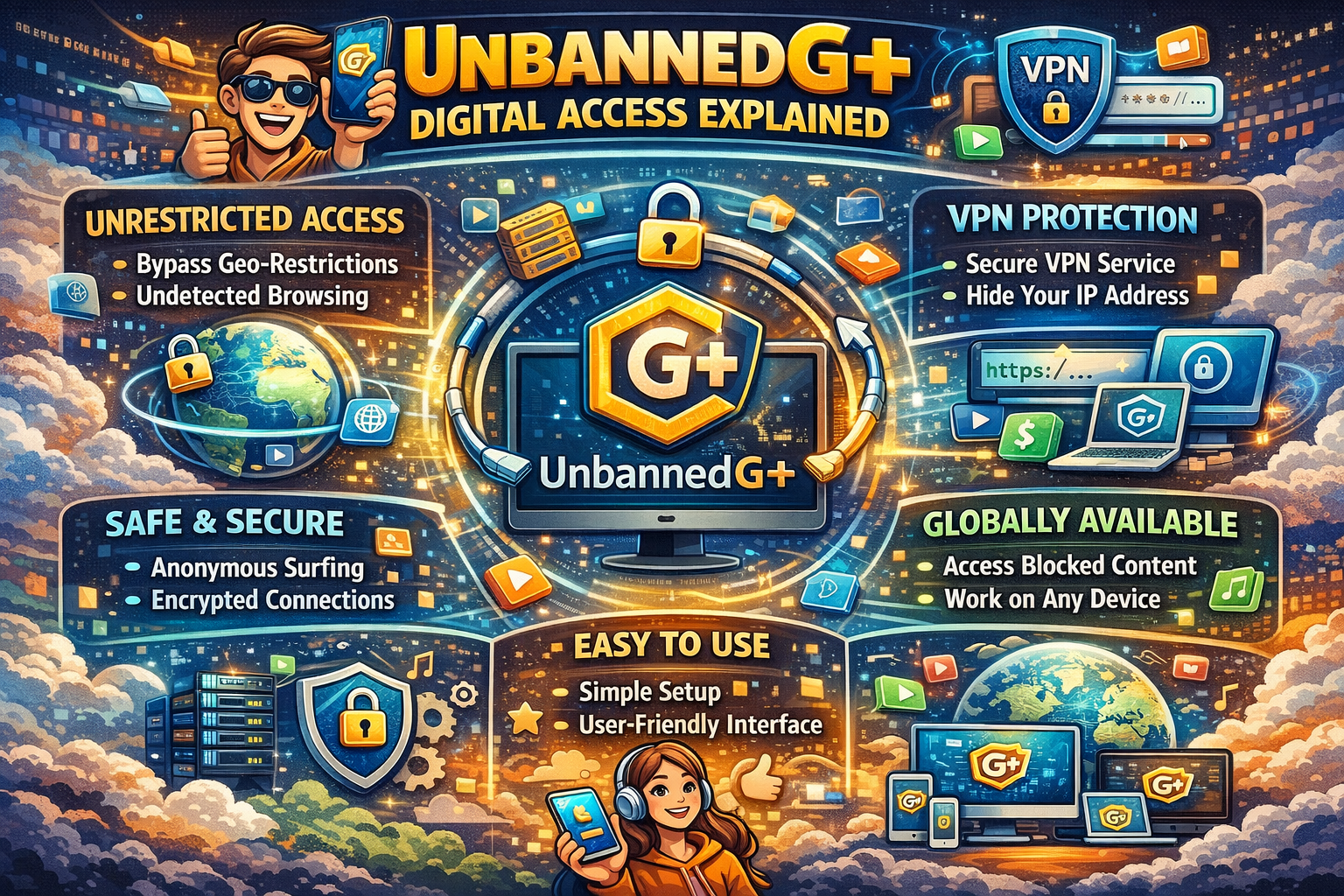 To clarify and orientate the user in the online restrictions and digital access restrictions, Unbannedg+ is utilized.